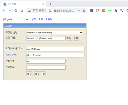 콘솔 화면에서 JDBC URL 칸이 있는데 초기 화면에서 이 값은 jdbc:h2~/test 와 같이 설정되어 있다.