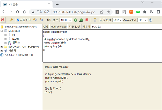 콘솔 화면의 JDBC URL값을 jdbc:h2:tcp://localhost/~/test로 바꾸어주면 된다.