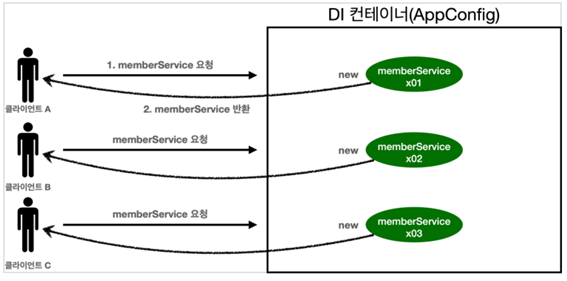 웹 애플리케이션에서는 싱글톤 패턴이 많이 활용된다. 웹 애플리케이션은 보통 여러 클라이언트가 서버에 동시에 요청을 한다. 아래 그림과 같이 클라이언트가 memberService를 요청하면 new로 객체를 생성하여 반환해준다. 여러 클라이언트가 요청할 때마다 객체를 새로 생성하여 반환하기 때문에 메모리 낭비가 심하다. 이러한 문제를 해결하기 위해 등장한 방안이 해당 객체가 딱 1개만 생성되고 다른 클라이언트들에게 공유하도록 설계하는 것이고 이를 싱글톤 패턴이라 한다.
