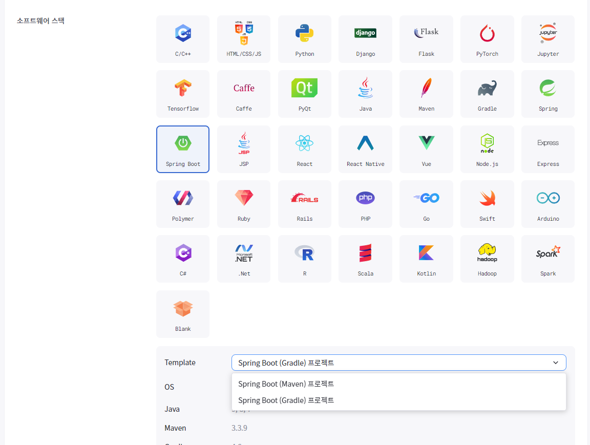 1. 소프트웨어 스택은 Spring Boot을 선택하고, Template은 gradle을 선택하여 컨테이너를 생성한다.
