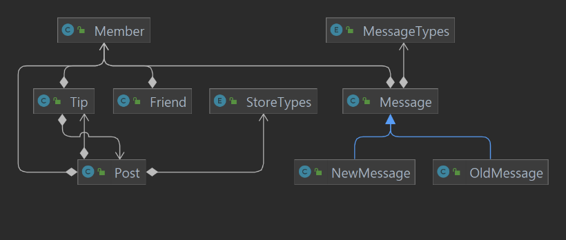 프로젝트의 엔티티들은 다음과 같은 관계를 맺고 있다. 인텔리제이의 다이어그램 그려주는 기능을 처음 써보고 신기해서 넣어봤다.
